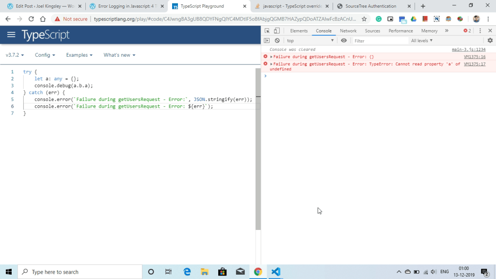If you look carefully at the console in the screenshot below you would find that for JSON.stringify(err) the error object is printed as {}. This is definitely not something which would help us. But the same error object prints a more informative message when printed using ${err}. The reason this happens is because JSON.stringify serializes only enumerable properties in an object. Since the TypeError object does not have enumerable properties, JSON.stringify returns an empty object string. But on the other hand however, if we use ${err} instead of JSON.stringify at all places, then whenever there is a custom error object being returned from an inner catch block, that would always be printed as [object Object] at all places. This is a catch-22 situation.