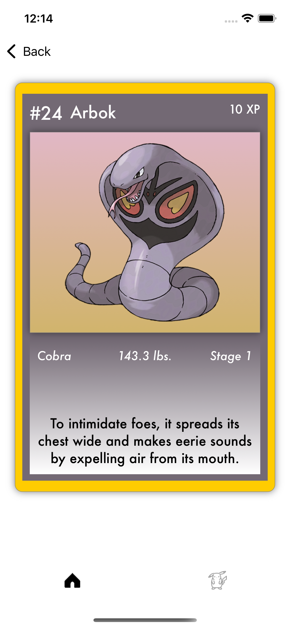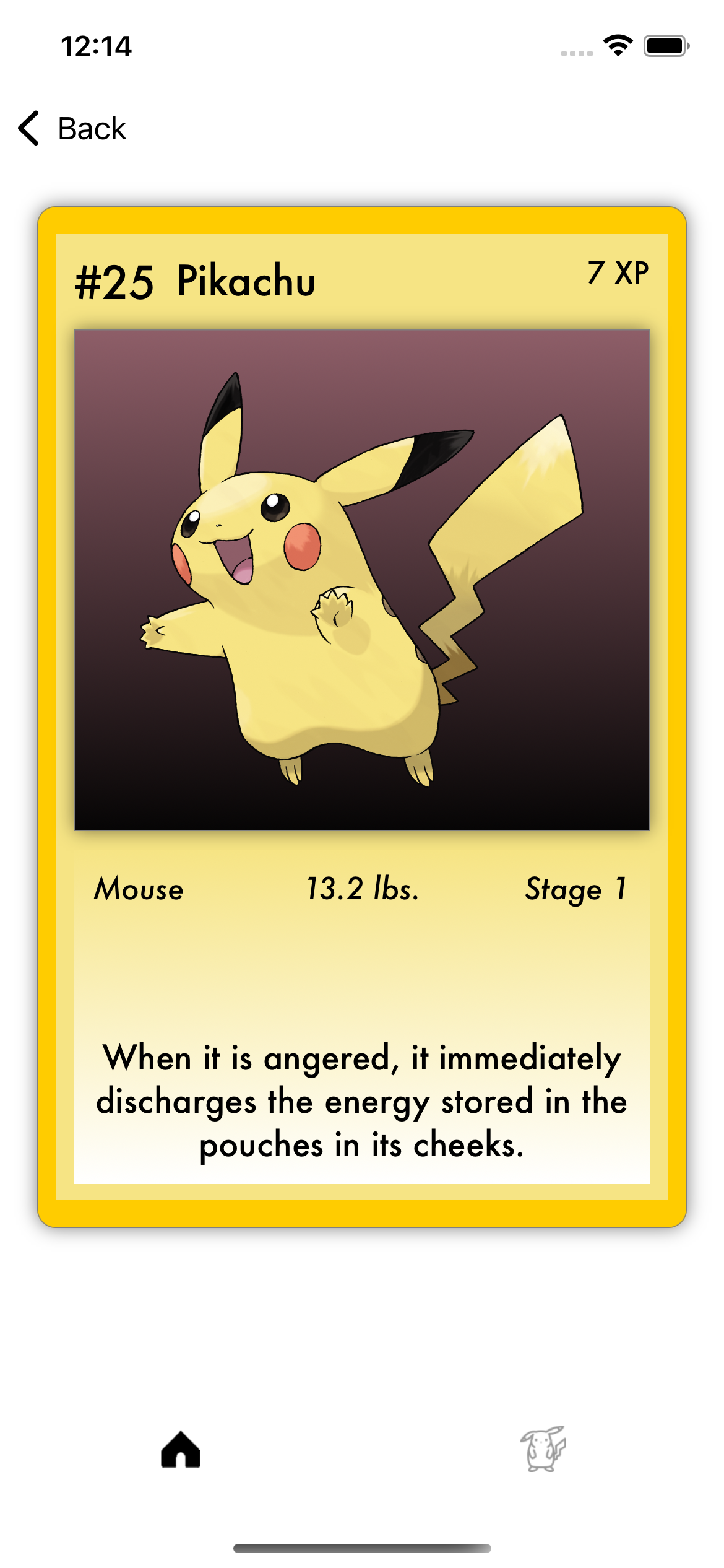 When the user clicks on a card on the home screen, the user is taken to the detail screen where the user sees the Pokemon Card with all the details. This screen has a more sophisticated UI with the background and borders all dynamically generated in run time by just using the colors found in the Pokemon’s image.